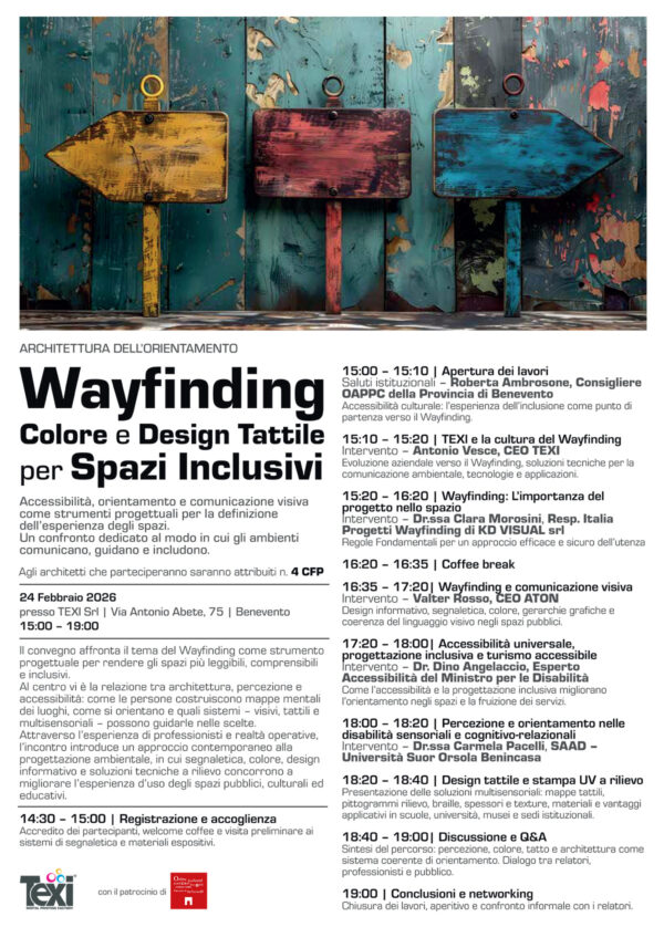 Il 24 febbraio, presso la sede di TEXI | Digital Printing Factory a Benevento, abbiamo ospitato l’OPEN HOUSE “Wayfinding, Colore e Design Tattile per Spazi Inclusivi”, evento organizzato da TEXI con il patrocinio dell’Ordine degli Architetti PPC della Provincia di Benevento.
