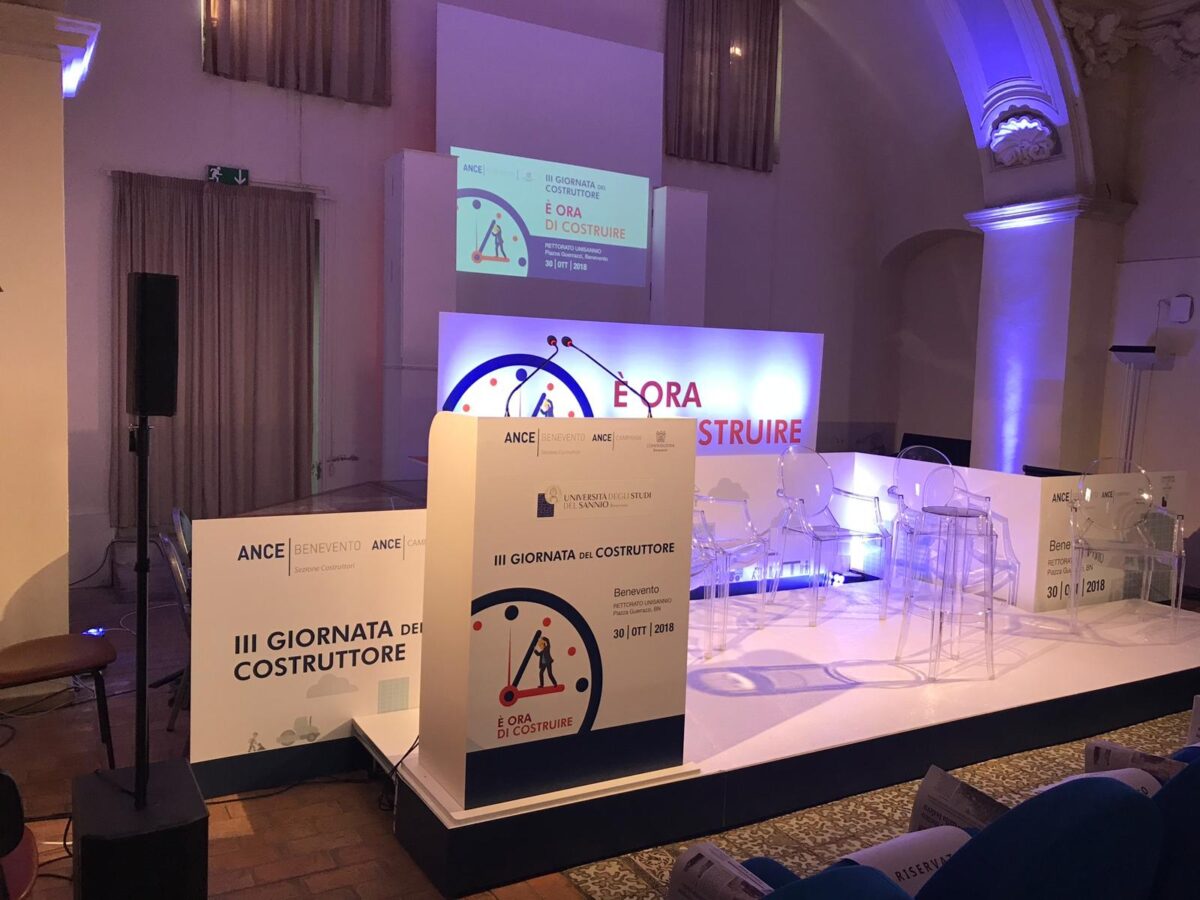 Progettazione tecnica, consulenza e direzione lavori per allestimento scenografico per evento ANCE – TERZA GIORNATA DEL COSTRUTTORE SANNITA indetto presso la splendida location di Palazzo San Domenico (Rettorato Unisannio) – Piazza Guerrazzi, Benevento.