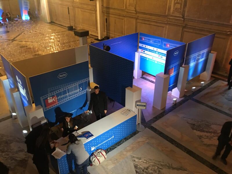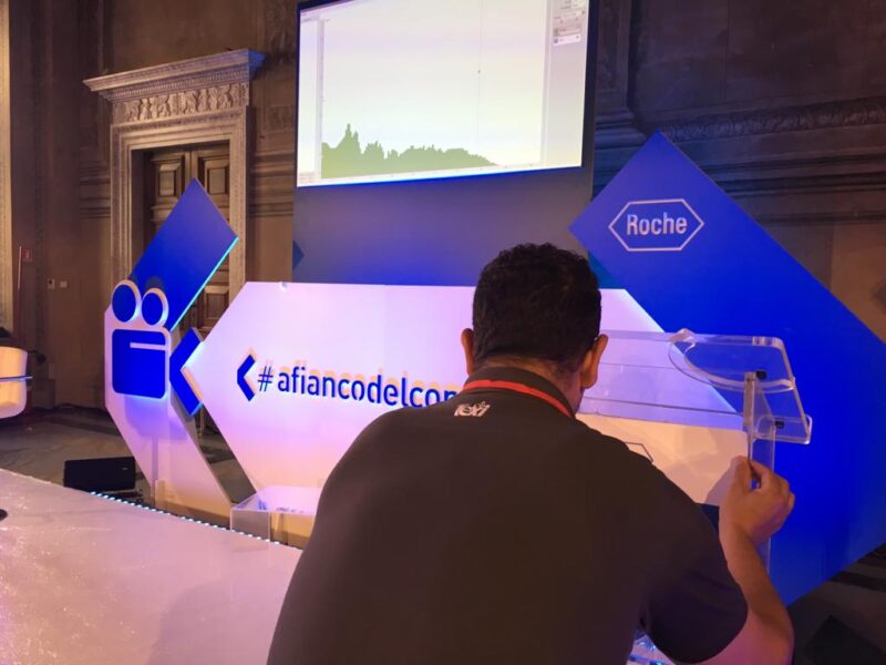 Per il palcoscenico sono stati installati fondali autoportanti con stampa diretta UV su Pannelli Communication con particolari effetti tridimensionali e sagomature dell’opera del Paladino. Il tutto impreziosito con sedute e tavolino in plexiglass.