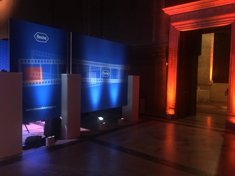Si notino i particolari effetti scenografici a luce fredda, appositamente predisposti per risaltare la maestosità dell’Auditorium, in perfetta sintonia con l’intero allestimento realizzato.